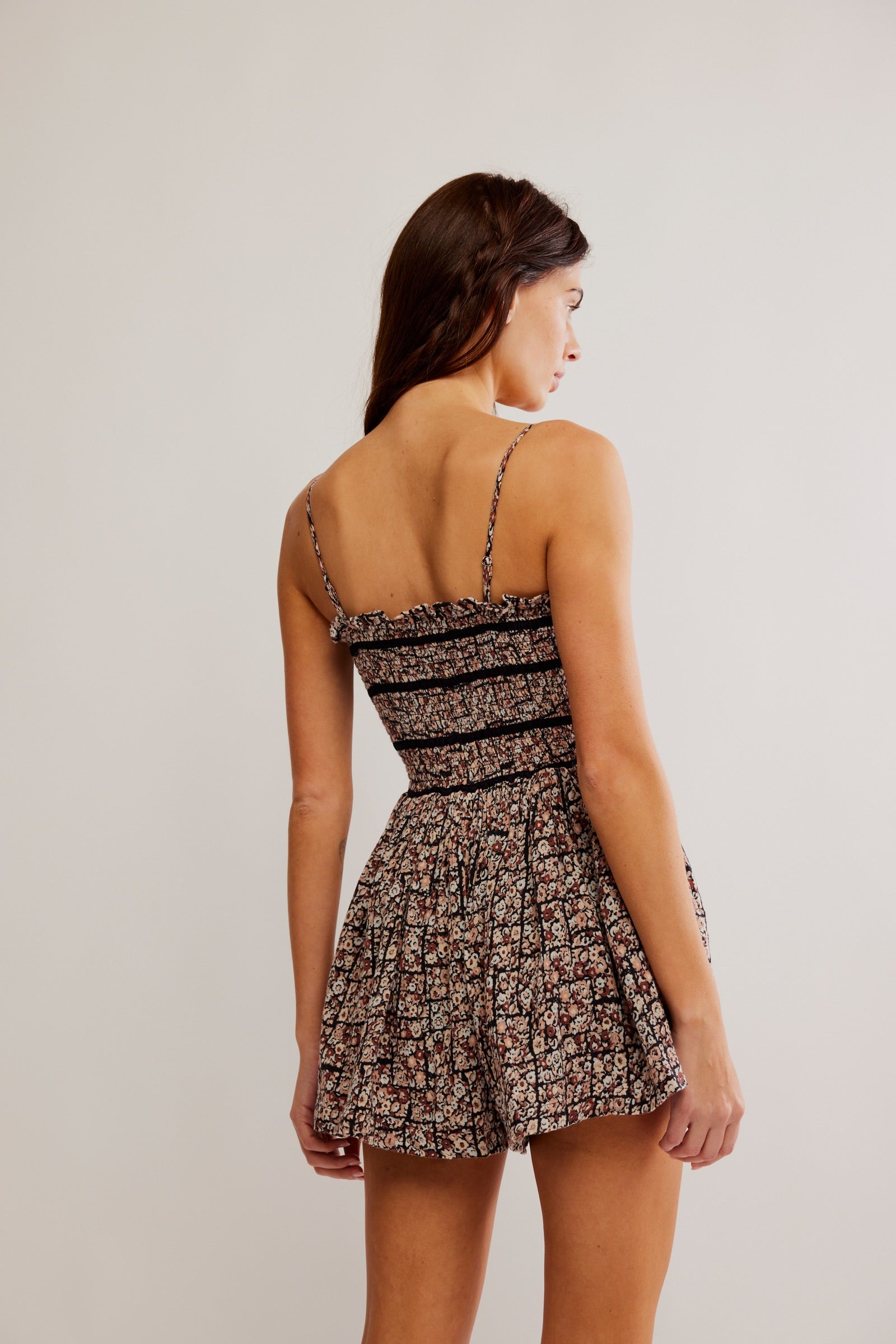 Features: Soft cotton fabrication, print all over, straight-neckline, thin adjustable shoulder straps, smocked bodice with a stretchy feel, gathered shorts, lined